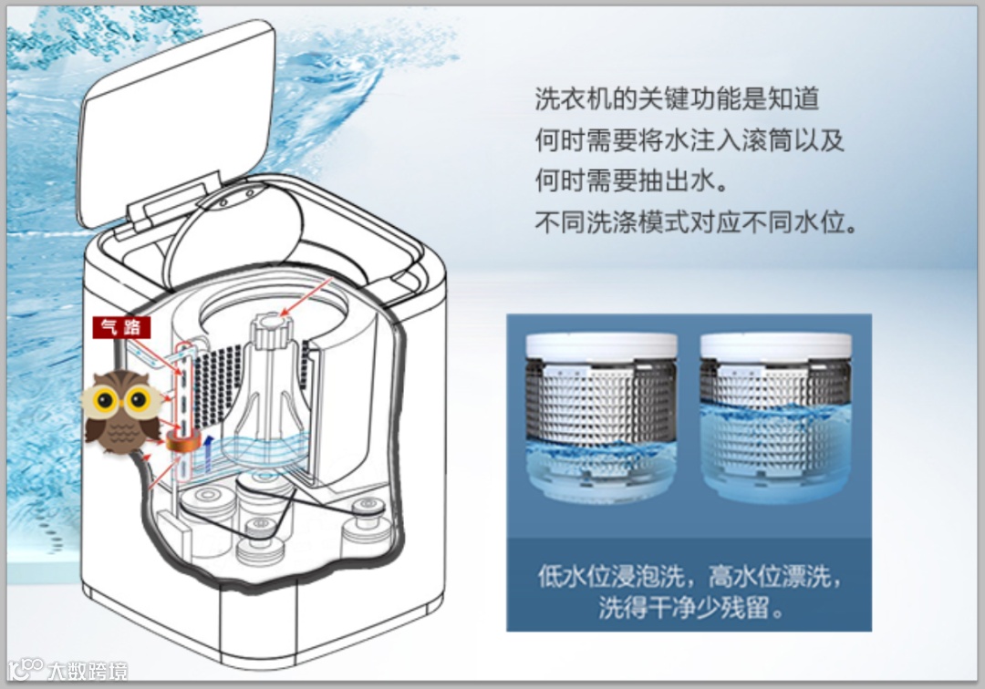在洗衣机家电中,一个可靠的水位检测系统是必须的。常用的洗衣机水位信号状态有空桶,低水量,中水量,高水量,满水五种水位信号,水位检测电路将不同信号给至洗衣机的控制系统,以备洗衣机下一步的动作。传统的常用洗衣机的检测系统如下示意图:
