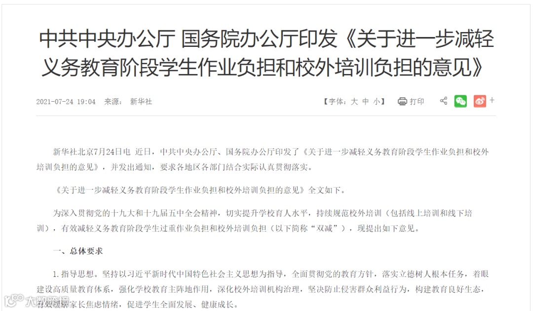 7月24日,中共中央办公厅、国务院办公厅印发了《关于进一步减轻义务教育阶段学生作业负担和校外培训负担的意见》。在“双减”原则的指导下,严格规定了“全面压减作业总量和时长,减轻学生过重作业负担”,“提升学校课后服务水平,满足学生多样化需求”、“坚持从严治理,全面规范校外培训行为”...