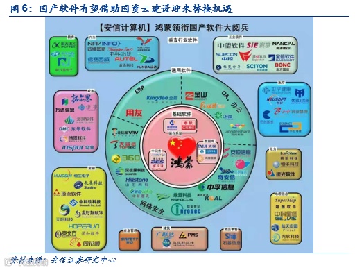 4、上层应用软件厂商国产替代的趋势进一步加强。底层的信创化要求上层的应用软件完成适配。目前,大部分的应用软件厂商已经完成了国产化的适配。随着工作负载的快速转移,应用软件顺势国产化也有望加速。以国产ERP企业用友网络为例,其2019年底即与天津国资云的大股东津投资本战略合作,2021年与国资云进行合作对接,目前已在国资云部署税务云、电子发票、统一入口系统、银企联云。