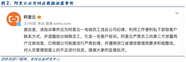 国企数据资源属于国有资产,应纳入国资监管和统一管理,保护国有数据资产安全是建设国资云的核心目的。此次天津《实施方案》中明确指出,国企数据资源属于国有资产,应纳入国资监管和统一管理,这是国资云的核心目的。近期阿里云向第三方泄露客户数据更进一步引发对第三方公有云数据安全的担忧。8月23日,阿里云就“泄露用户注册信息”事件对外回应,表示阿里云一电销员工违反公司纪律,利用工作便利私下获取客户联系方式,并透露给分销商员工。阿里云作为国内收入规模最大的公有云企业,其对客户数据的粗放管理引发了市场对其数据治理的担忧。