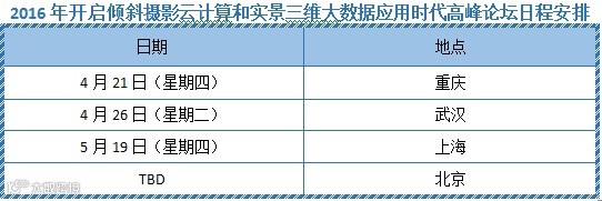 论坛将围绕“倾斜摄影多源数据获取、多元数据融合、海量数据云处理、基于实景三维的6D测绘产品、BIM集成、大数据模拟分析、实景三维一站式解决方案及智慧城市云服务”展开,同时将展示无人机驾驶飞行器及倾斜摄影航摄仪等最新科技成果,为互联网+/DT时代的用户提供完整、高效三维空间信息生产、大数据增值服务及整体解决方案。