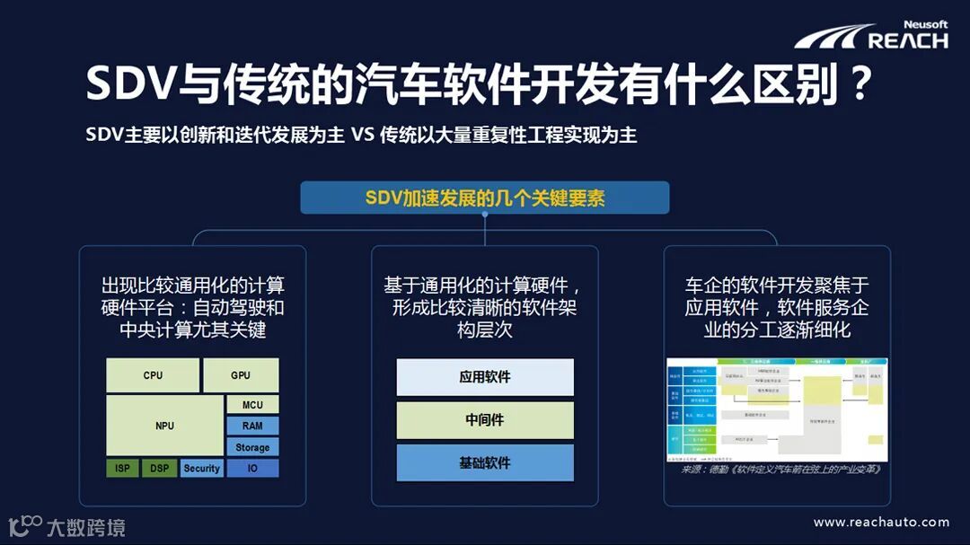 在软件定义汽车发展的过程中,通用化硬件平台的出现、和基于通用化硬件而逐步形成的清晰的软件架构,以及行业分工逐渐细化,车企的软件开发工作向应用层软件聚焦是引领其快速发展的三大关键要素。