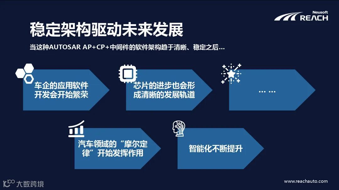 当通用化的硬件不断涌现,AUTOSARAdaptive + Classic + 中间件的软件架构趋于稳定,并通过工程化服务完成适配工作后,应用软件开发将快速的繁荣,芯片的能力、属性以及需要满足的功能和框架可以被清晰的定义,芯片产业可以在更加确定的轨道上发展,“摩尔定律”会随着应用的拉动在汽车工业领域中出现,算力、处理能力、带宽等等将加速进入快速发展时期,促进汽车智能化和软件定义汽车生态的高速发展。