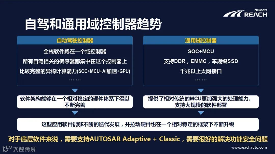 通用化硬件对于软件定义汽车的发展有着巨大的影响,随着芯片技术和产品的进步,域控制器的方案得以实现并快速发展。整车架构在向下一代迭代发展的时候,软件和上层应用是否能够稳定持续的发展,尤其在自动驾驶和通用域控制器方面,依赖于芯片和处理器的发展路径能否趋于稳定。