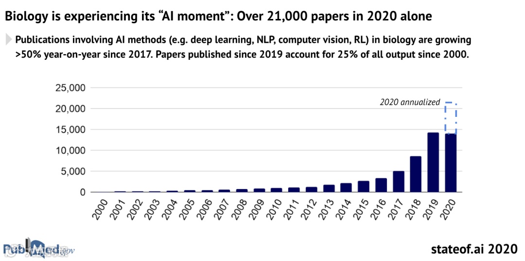 生物研究正在经历「AI时刻」:仅2020年,就有超过21,000篇相关论文发表。自2017年以来,涉及AI方法(例如深度学习,NLP,计算机视觉,RL)的出版物同比增长超过50%。