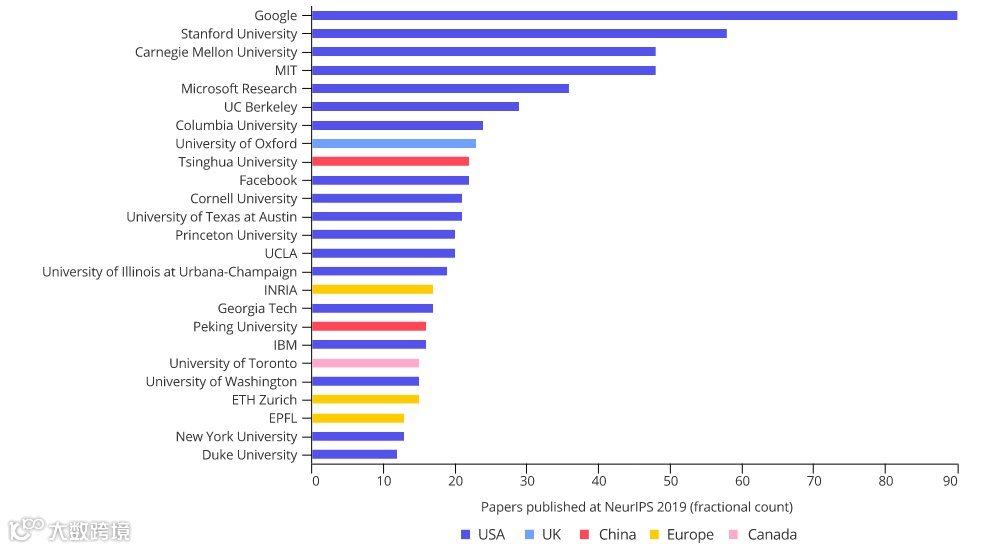 从NeurIPS 2019论文发表情况来看,美国保持其主导地位,谷歌、斯坦福大学、CMU、麻省理工学院和微软研究院占据前五名。