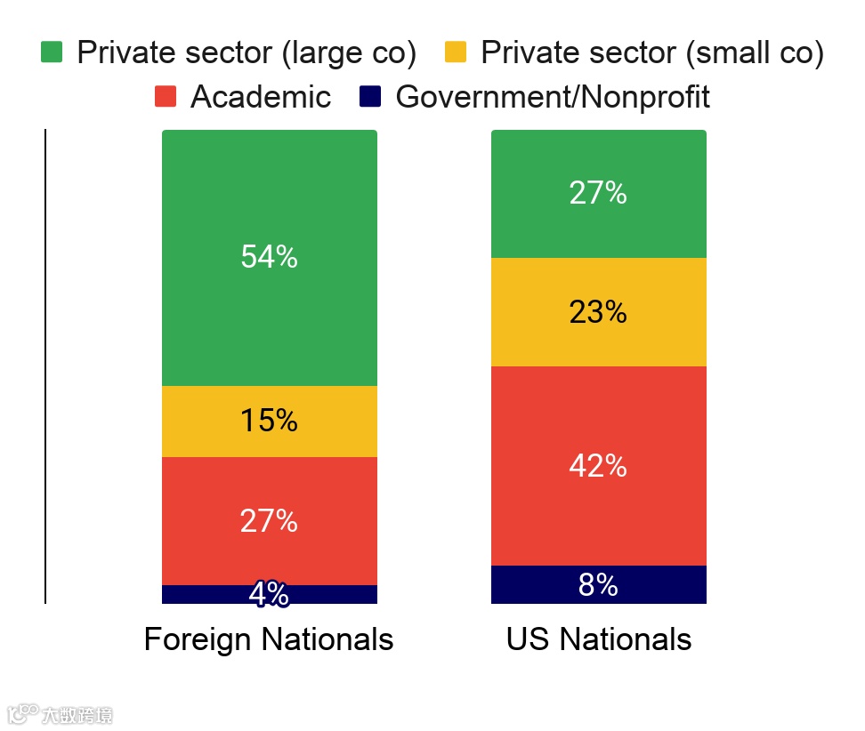 通过对比发现,美国人工智能博士项目的外国毕业生最有可能在大公司工作,而美国本土人更有可能在初创公司或学术界工作。