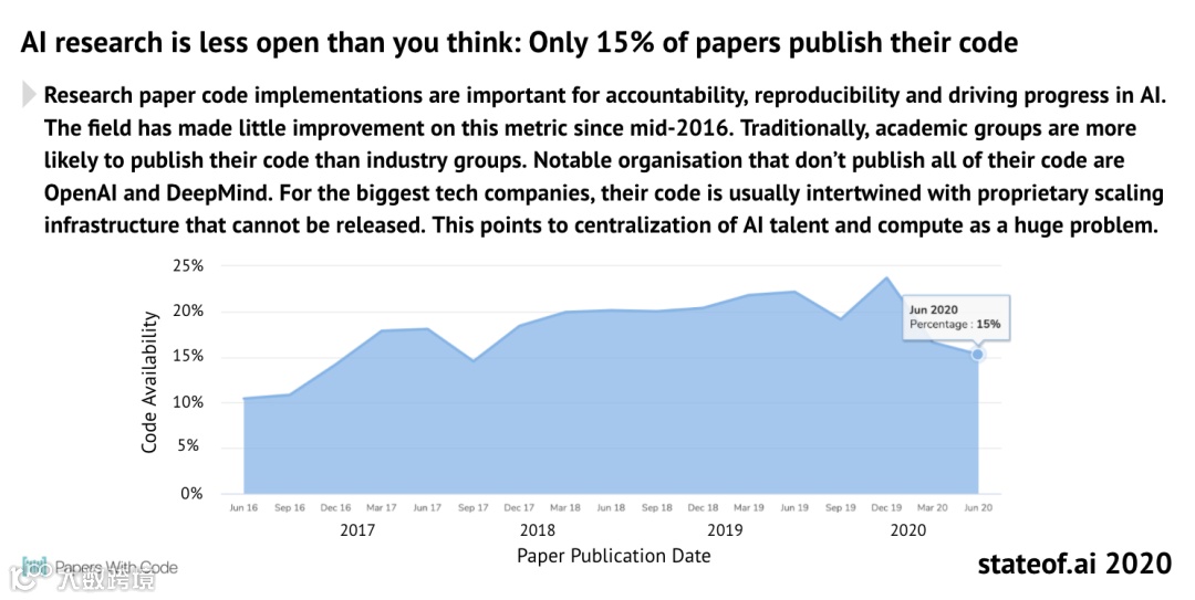 自2016年中以来,这一指标几乎没有改善。一般来讲,学术团体比行业团体更可能发布其代码。尚未发布所有代码的著名组织包括OpenAl和DeepMind。对于大型科技公司,其代码通常与其私有的基础结构交织在一起。