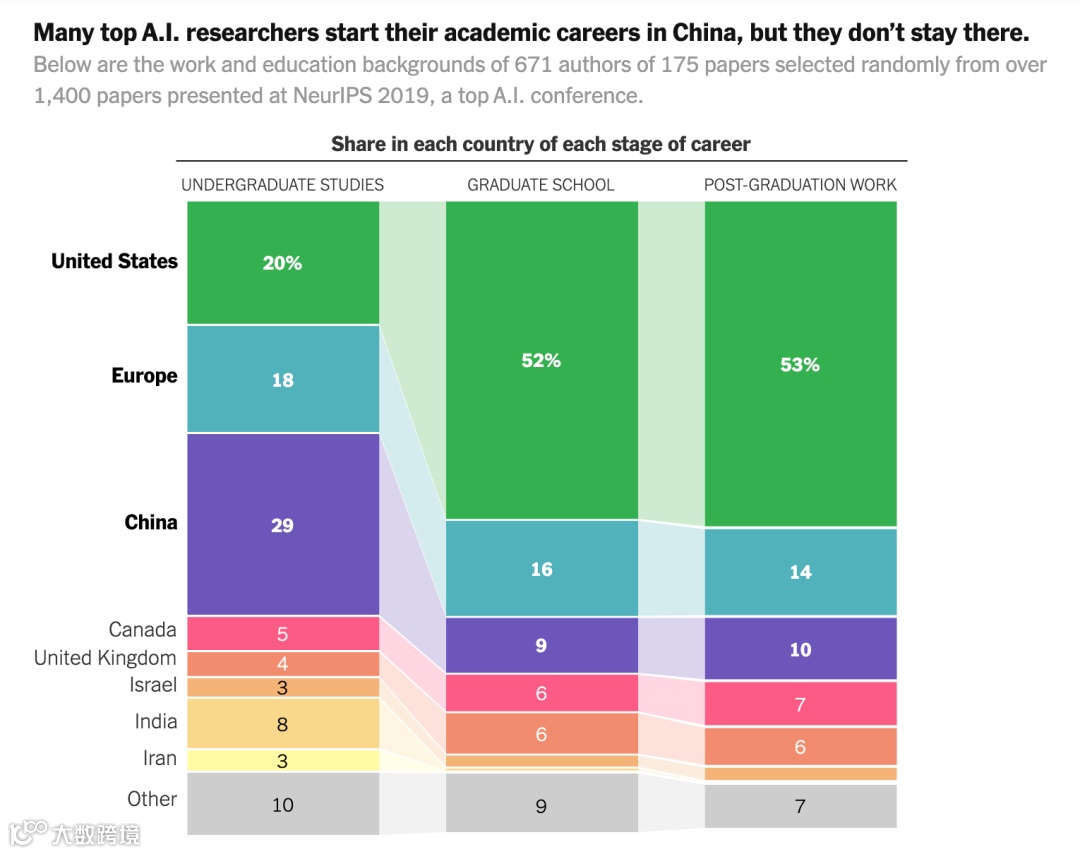但在离开中国的大学后,54%的毕业生却选择前往美国在NeurIPS发表论文。