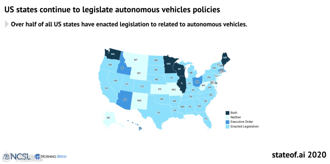 自动驾驶方面,美国一半以上的州已经颁布了有关自动驾驶的立法。
