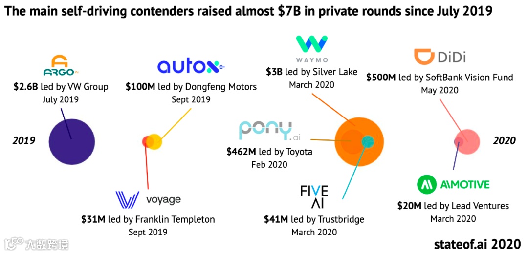 不得不说,强大的资金支持,才是AI产业发展的重要力量。在国内,像滴滴这样的出行公司选择自动驾驶业务剥离,从软银远景基金等机构筹集了 5 亿美元。到今年 7 月,滴滴在上海推出了自动驾驶汽车服务。