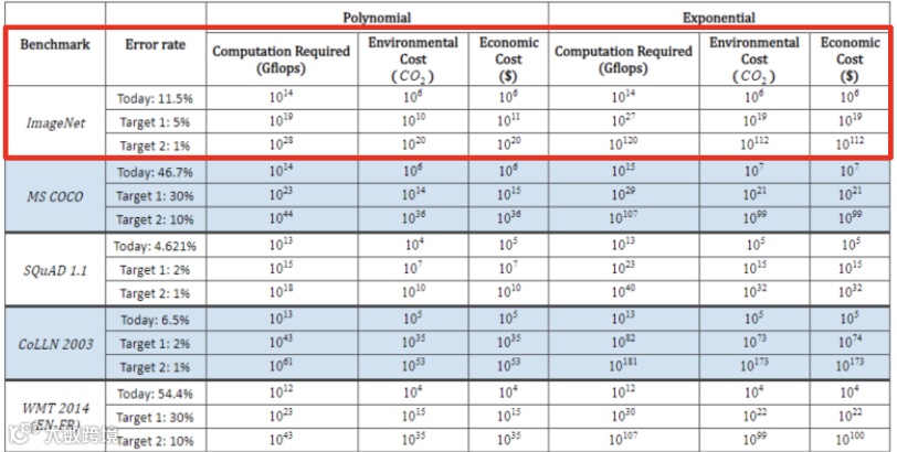 报告指出,如果没有重大突破,将ImageNet错误率从11.5%降至1%会需要数千亿美元!许多从业者认为ML成熟领域的进展目前有些停滞不前。