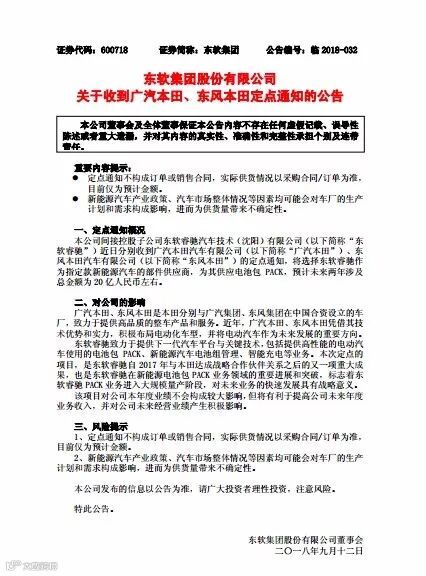 近日,东软睿驰分别收到广汽本田、东风本田的定点通知,双方将选择东软睿驰作为指定款新能源汽车的部件供应商,为其供应电池包PACK,预计未来两年涉及总金额为20亿人民币左右。