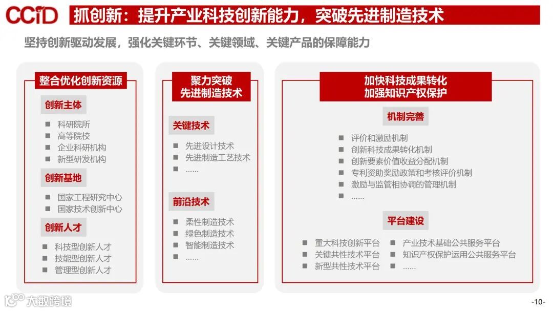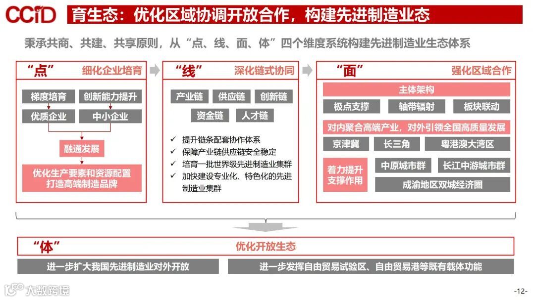 “抓创新”是要提升产业科技创新能力,坚持创新驱动发展,加快建设科技强国。具体来看,是要整合优化创新资源、聚力突破先进制造关键和前沿技术、加快科技成果转化、加强知识产权保护。“求变革”是要推动质量效率动力变革,夯实先进制造基础。具体来看,是要实施产业基础再造工程、深化供给侧结构性改革、推动产业协同多元融合。“育生态”是要优化区域协调开放合作,秉承共商、共建、共享原则,从“点、线、面、体”四个维度系统优化区域协调和开放合作,构建先进制造业发展生态。具体来看,是要细化企业培育——建“点”、要深化链式协同——连“线”、要强化区域合作——成“面”、要优化开放生态——组“体”。