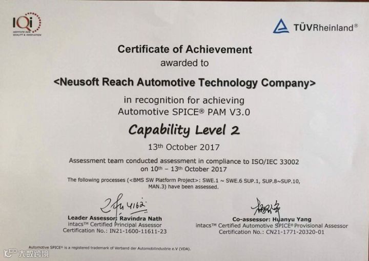 此次东软睿驰通过了A-SPICE项目级Level2认证,评估范围为睿驰BMS软件平台开发。该项认证的通过标志着,东软睿驰的BMS产品的软件研发具备了完善的流程、标准,软件产品质量得到有效的保障。未来公司产品将更大程度地满足国际主流汽车厂商对BMS的质量要求,而且也大大提高了消费者对我国企业在新能源汽车领域发展前景的信心。