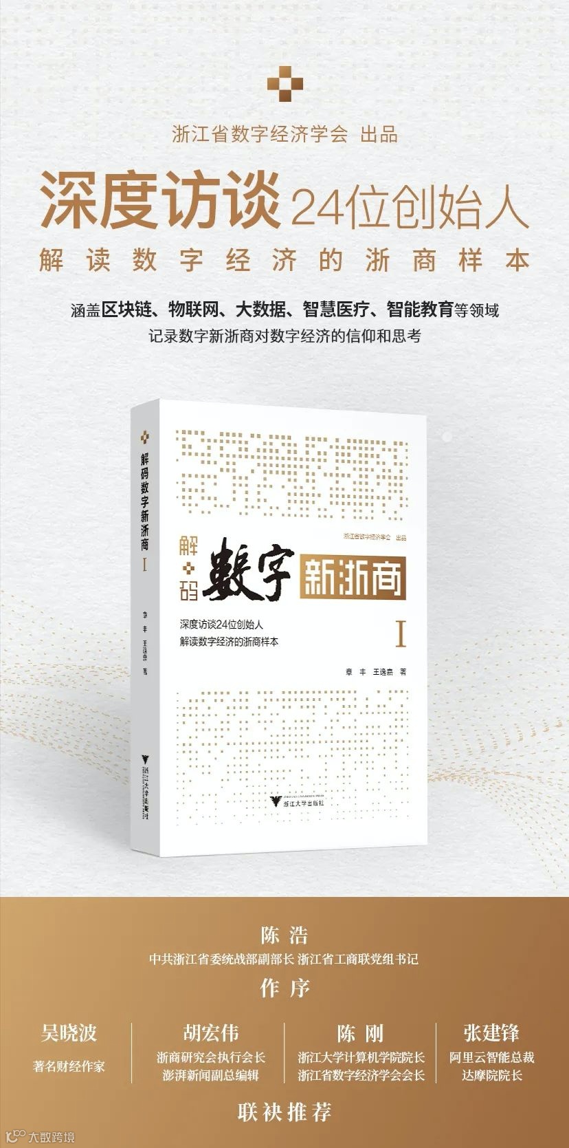 近日,《解码数字新浙商I》一书正式出版。该书通过24篇深度专访每日互动、涂鸦智能、微链、安恒信息等区块链、物联网、大数据、创投服务、智能医疗、智能教育不同领域企业创始人,记录了数字新浙商的创业故事与对数字经济的思考。