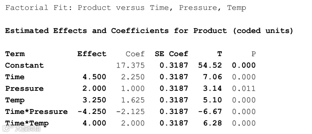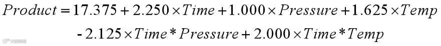 Time*Pressure、Time*Temp表明时间与压力、时间与温度的交互作用明显,对最后的结果有相对重要的影响。最后拟合出的Y= f(X) 关系式如下:
