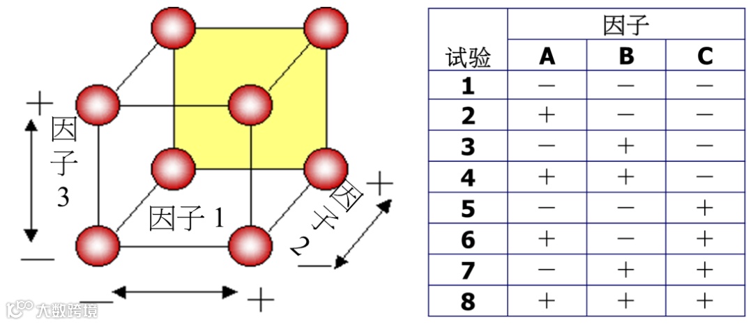 例如,一个23 因子设计式样,假设 A、B 与 C 三因子均有两水平,所以共有8个水准组合的因子设计。