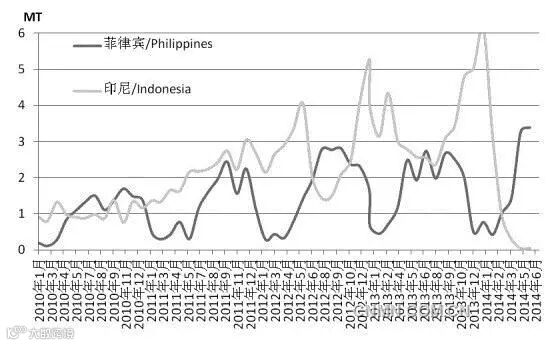“禁矿令”颁布后,中国增加了从斐济、牙买加、巴西和几内亚等国的铝土矿进口。目前,镍产量占世界总产量9%的菲律宾——也是中国在亚洲地区唯一的高品位红土镍矿来源,接棒印尼,大量出口镍矿,稳定了镍市场供应。随着未来新的镍矿进口渠道的拓展以及其他镍出口国对中国出口量的增加,镍资源的阶段性紧张将得到缓解。2014年上半年菲金属矿产品产值达到572.7亿比索,同比增长22%。其中,镍矿为310.3亿比索,占总产值的54.2%,同比增长59%。