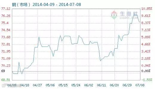7月8日铜(市场)商品指数为75.48,较上日下降了0.17点,较周期内最高点100.00点(2011-09-01)下降了24.52%,较2014年03月16日最低点64.73点上涨了16.61%。(注:周期指2011-09-01至今)。