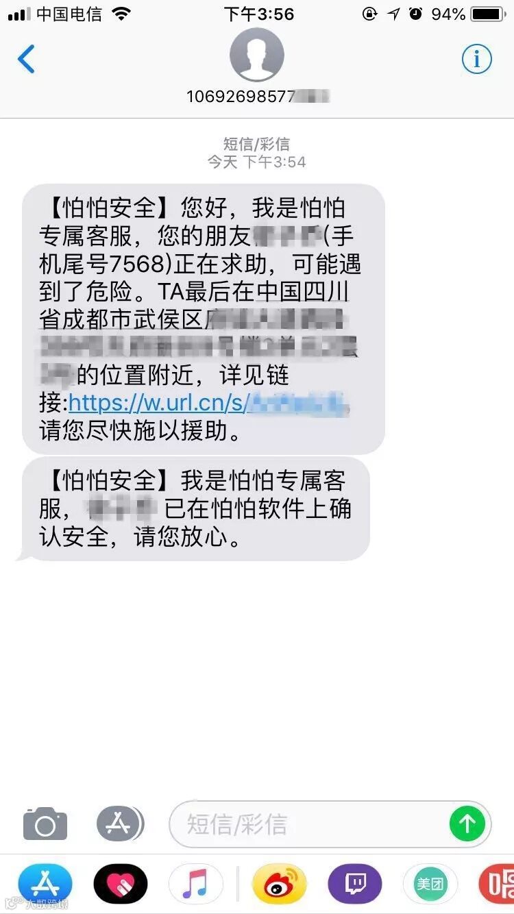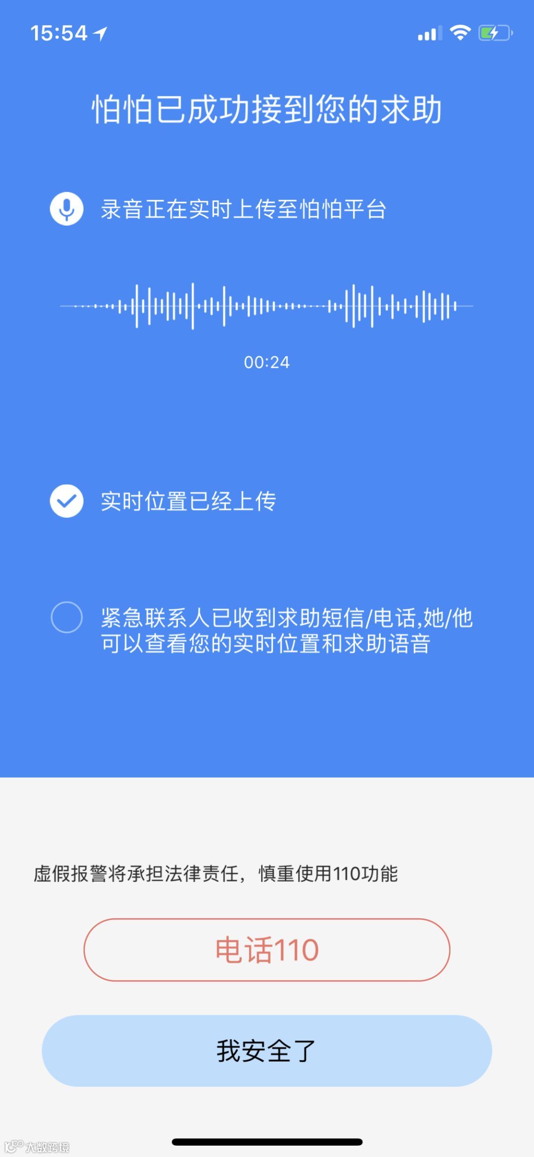 据说怕怕app有7x24小时客服在线值班,响应速度很快,小编测试了一下(其实只是为了截图没及时取消),我的紧急联系人在几分钟内便接到了怕怕客服的电话及短信。(手动点赞)