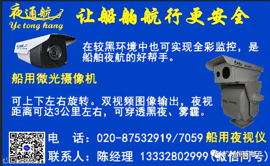 广州恒威电子科技有限公司是国家级高新技术企业,专业研发、生产:船用夜视仪、船用雾航仪、船用光电取证系统、船舶视频监控系统、船舶防碰撞系统、水上水下搜救系统、激光摄像机、远距离高清透雾摄像机、红外热像仪、超视距红外光电系统等特种安防产品。
