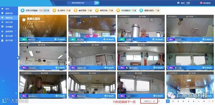 系统同时提供 PC 电脑端与微信移动端,船公司或渔政、海事、应急等执法部门可通过PC端及移动设备端APP,远程管理界面实时查看船舶状态,实现便利高效的应急处置与安全监管。通过船舶子界面,我们可以随时查看监管的船舶实时画面或调取告警录像,统计异常/正常船舶的数量,异常类型包括:无人值守、疲劳驾驶(闭眼、打哈欠)、使用手机、未正视前方、摄像头被遮挡等。
