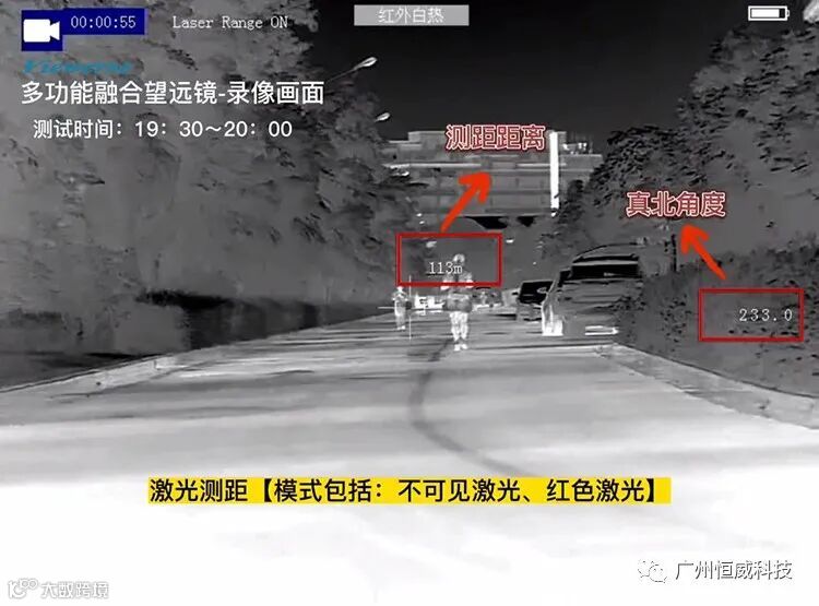 在夜间执法侦查中,通过使用多功能融合望远镜,能快速发现和识别地面、丛林、江河、海上的各种目标。此外,利用激光测距功能(包括不可见激光和红色激光)可对目标距离探测识别,探测1.7×0.5m人型目标距离距离为1.55km,识别距离为500m;探测2.3m车型目标距离距离为2.1km,识别距离为700m。