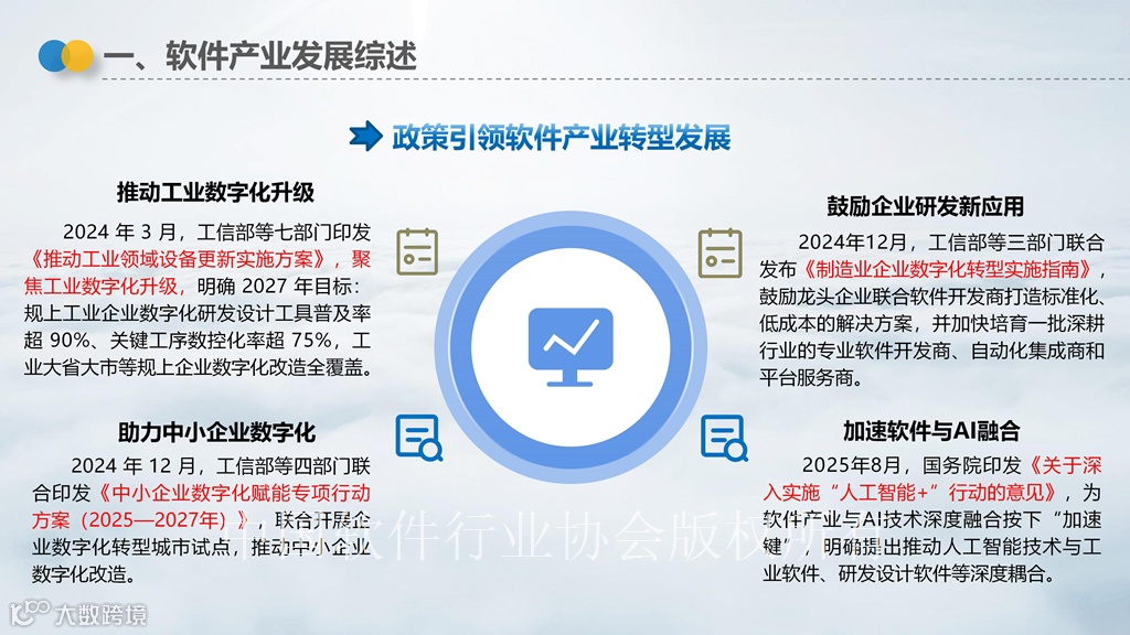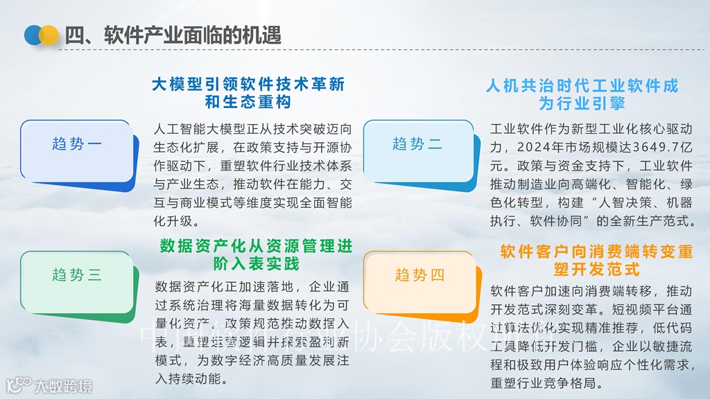 《报告》系统梳理了新形势下我国软件产业面临的八大历史性机遇,具体包括大模型引领技术革新与生态重构、人机共治时代工业软件成为行业引擎、数据资产化从资源管理进阶入表实践、软件客户向消费端转变重塑开发范式、数据联接跨界融合驱动社会智能治理、软件企业并购促技术升级与市场拓展、软件驱动行业数字化转型赋能新发展、软件出海服务外包并进重塑产业格局。这些机遇为产业高质量发展提供关键突破口。