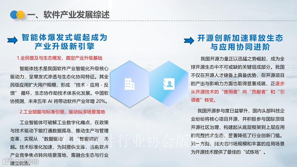 《报告》指出,我国软件产业正经历从规模扩张向质量提升的关键跃迁,成为数字经济发展的核心驱动力。在国产基础软件崛起与垂直大模型落地的双轮驱动下,产业结构持续优化,迈入价值深耕的新阶段。同时,智能体技术的爆发式渗透与开源生态的加速繁荣,进一步筑牢了产业智能化根基,推动技术创新从单点突破向体系化演进。