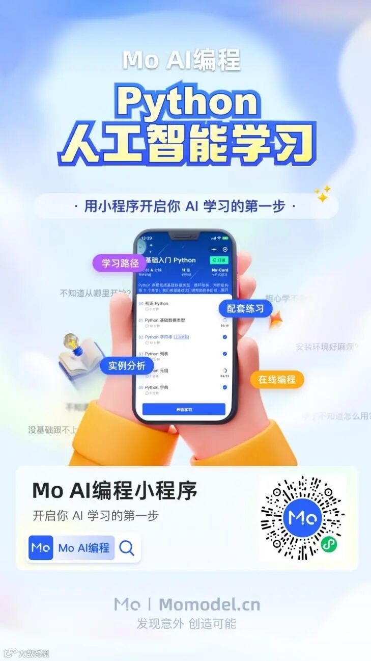 此外,我们还专门打造了一款适合入门的小程序——【Mo AI编程】,可以帮助大家拓展思维,欢迎扫码上方海报二维码开始学习。