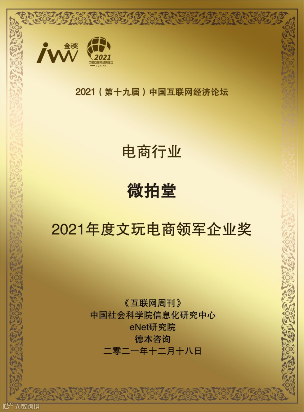 由中国科学院旗下的权威媒体《互联网周刊》主办、中国社会科学院信息化研究中心、eNet研究院、德本咨询联合举办的“2021(第十九届)中国互联网经济论坛”在北京举办,微拍堂与平安、斗鱼等知名品牌一齐入围“年度金i奖”榜单。作为文玩电商头部品牌,微拍堂凭借领先的行业规模、强劲的业务增长动力、出色的科技创新能力,获得“2021年度文玩电商领军企业奖”的殊荣,成为唯一上榜的文玩电商品牌。