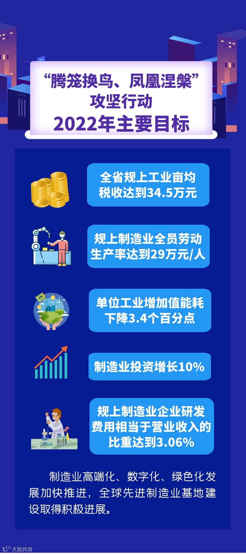 为贯彻落实中央经济工作会议、省委经济工作会议精神和《浙江省新一轮制造业“腾笼换鸟、凤凰涅槃”攻坚行动方案》(浙政发〔2021〕31号),聚焦聚力高质量发展、竞争力提升、现代化先行,坚定不移推进淘汰落后、创新强工、招大引强、质量提升四大攻坚行动,加快产业结构优化升级,奋力打造全球先进制造业基地,推进经济高质量发展先行示范,加快高质量发展建设共同富裕示范区,浙江省制造业高质量发展领导小组办公室制定《浙江省新一轮制造业“腾笼换鸟、凤凰涅槃”攻坚行动2022年工作要点》,内容如下: