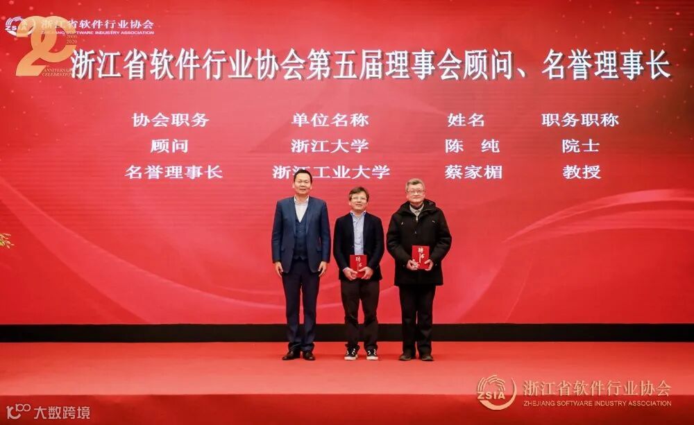 王小号秘书长发布了浙江省软件行业20年大事记、协会20周年奖项名单、协会2020年度先进工作者、2020年浙江省软件企业核心竞争力评价结果。会议现场举行隆重的颁奖典礼,表彰了浙江省软件行业协会20周年功勋人物、突出贡献人物、突出贡献企业、协会工作贡献奖获得者及2020年度先进工作者。浙江省软件行业协会20周年功勋人物陈纯院士给新一届理事会和企业家们寄语,指出协会对推动官学商融合发展起到了积极推动作用,并希望新一届理事会更上一层楼。