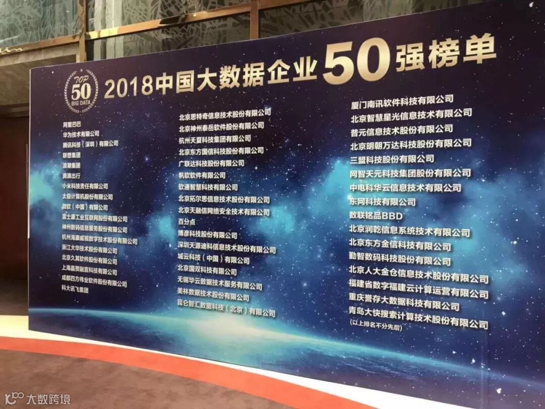 “2018中国大数据企业50强”,是由工信部中国电子信息产业发展研究院主办,中国大数据产业生态联盟承办,以广泛而深入的调研为依托,历经5个月的调研工作覆盖了2000余家大数据企业。该评选从企业规模、研发投入、创新能力、应用案例、产品及方案成熟度、投资及发展潜力等多个维度设置评价指标的综合体系,覆盖到了中国大数据产业生态链上的各个重要环节。榜单具有较高公信力。
