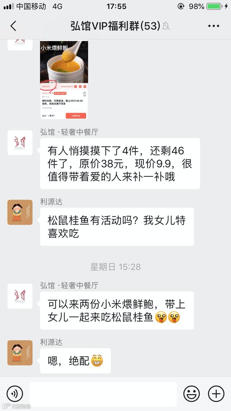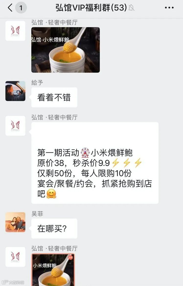 此外,用于刺激复购的群内「秒杀」活动也初见成效,未来「弘馆」还会持续测试菜品和券,摸索顾客感兴趣的内容,给顾客带来更多优惠,也给自己增加更多订单。