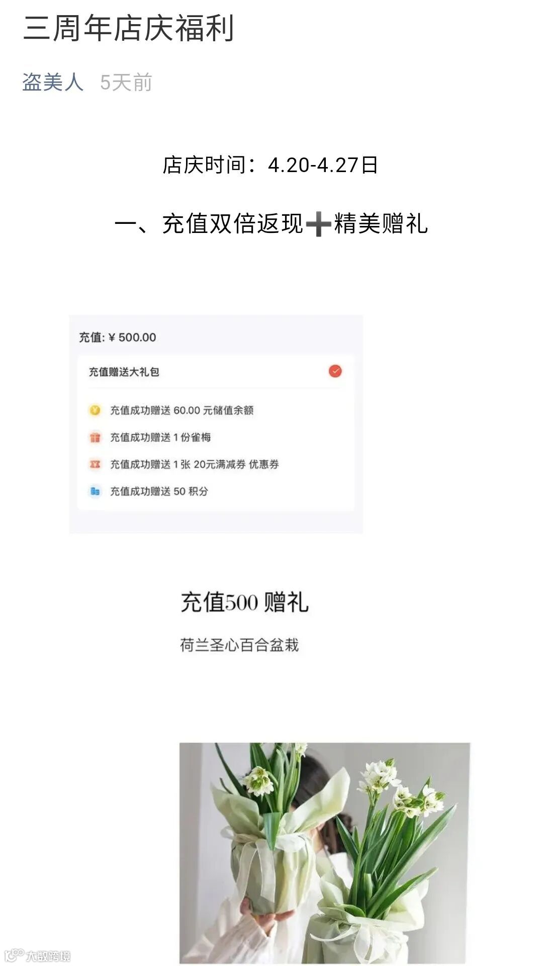 另外,对于复购多的老客,利用会员储值⁵来维护,也是非常好的办法。如:近期店庆活动开放储值满额送活动,包括充值满 500/1000/2000/5000 四个梯度,不仅给到了更多的储值余额,还加送实物奖品、满减券和会员积分。