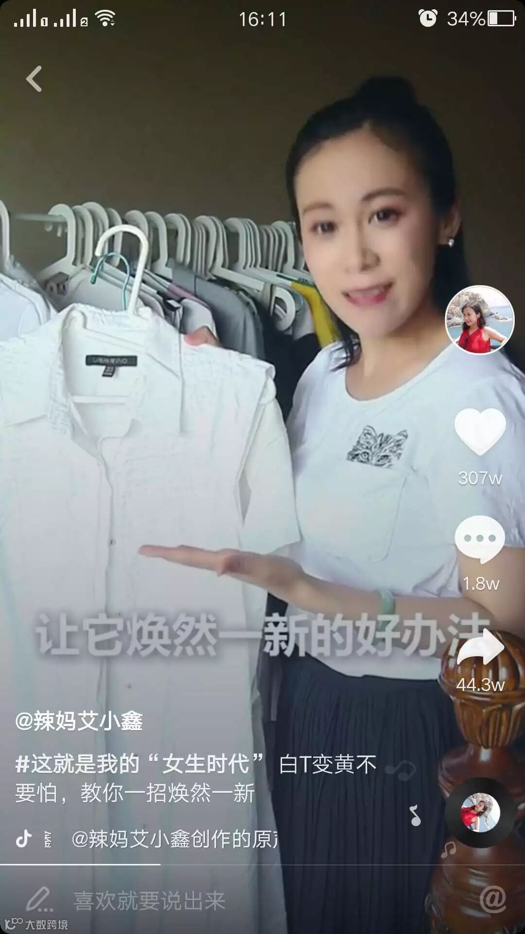 【网红推荐】抖音生活达人辣妈艾小鑫在抖音视频中演示如何使用彩漂剂让变黄的白色衣服焕然一新,视频刷爆抖音(播放量7000W+,点赞量307W+,转发量44W+),网友纷纷通过评论和私信获取商品购买渠道。