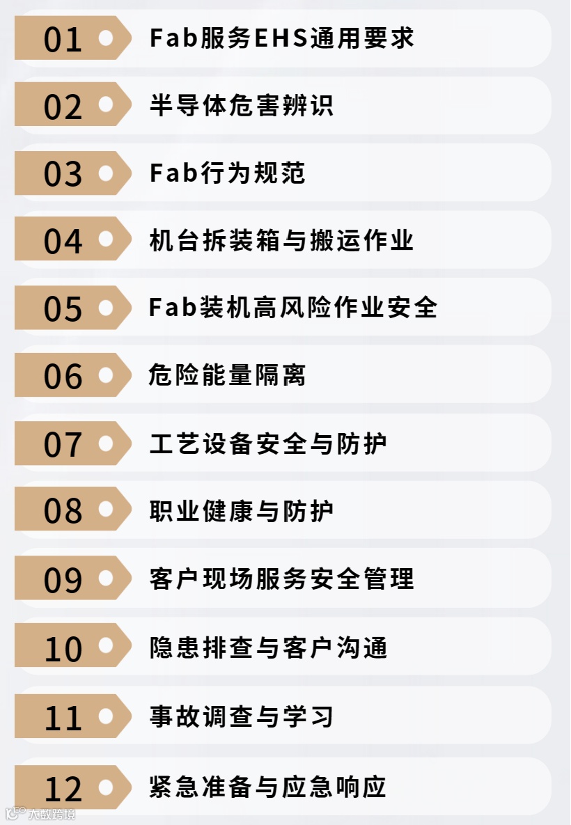 半导体设备服务商Fab安全与装机操作课程旨在提供全面的安全管理和装机操作技术培训,使你的团队能够熟练掌握最佳实践,从而有效降低潜在风险,并确保装机操作的安全性和可靠性。同时,我们还提供职业健康与防护、客户现场服务安全管理、事故调查与学习等专业领域的培训,助力企业提升半导体设备服务领域的专业能力。