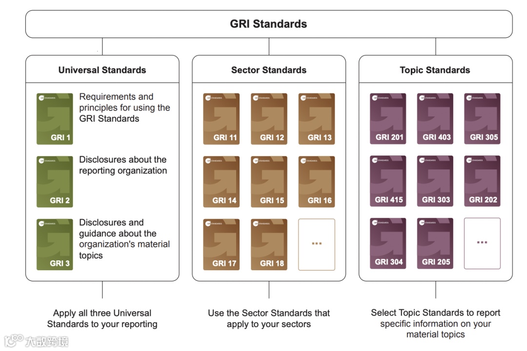 GRI标准是由相互关联的多套标准组成的模块系统。报告流程基于三套标准:GRI通用标准(适用于所有组织);GRI行业标准(适用于特定行业);GRI议题标准(关于具体议题的披露项)。使用这些标准确定实质性(相关)议题,有助于组织实现可持续发展。
