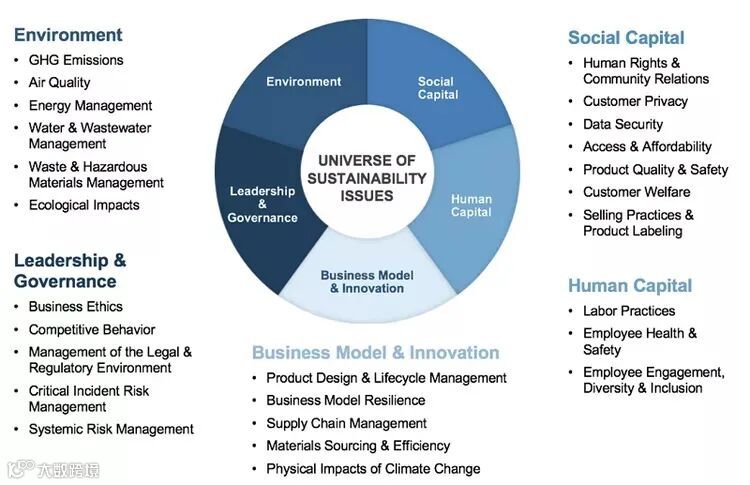 作为ESG指导框架,SASB标准确定了可能影响77个行业公司的财务绩效和企业价值的可持续性问题。这些行业特定标准包括六个披露主题和13个会计指标,涵盖可持续发展的五个关键维度——环境、社会资本、人力资本、商业模式和创新、以及领导力和治理。
