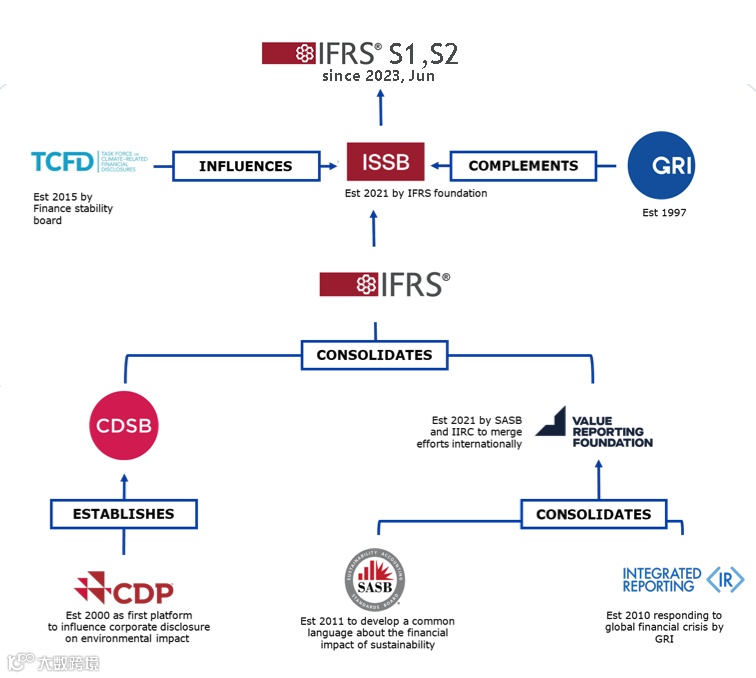 2021年,在格拉斯哥举行的联合国气候变化框架公约COP26之际,IFRS基金会宣布成立新的国际可持续发展标准委员会ISSB,其任务是创建和开发与可持续发展相关的财务报告标准,以满足投资者对可持续发展报告的需求。ISSB以市场主导的投资者报告倡议工作为基础,这些倡议包括气候披露标准委员会(CDSB)、气候相关财务披露工作组(TCFD)、价值报告基金会的综合报告框架和基于行业的SASB标准,以及世界经济论坛的利益相关者资本主义指标。