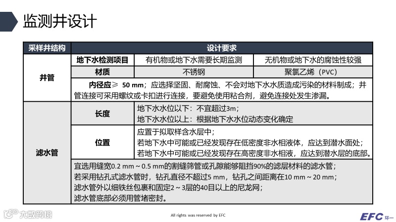 原则上,每个重点区域或重点设施周边至少布设1个地下水监测点。具体数量应根据待监测区域大小及污染物扩散途径等实际情况进行适当调整。每个重点单位应至少布设3口地下水监测井,且监测井应间隔一定距离按照三角形布设。