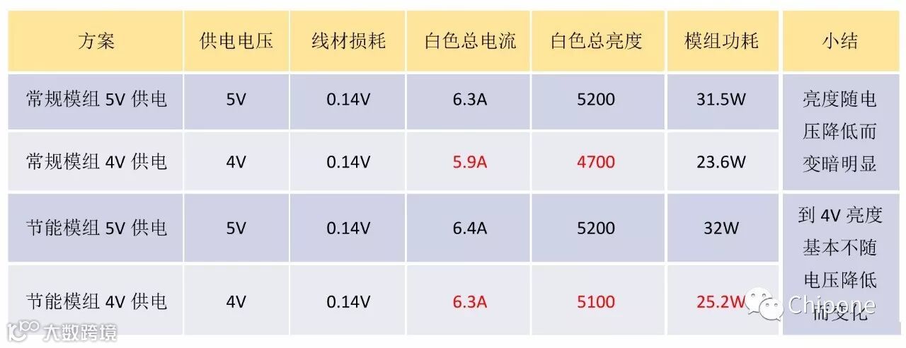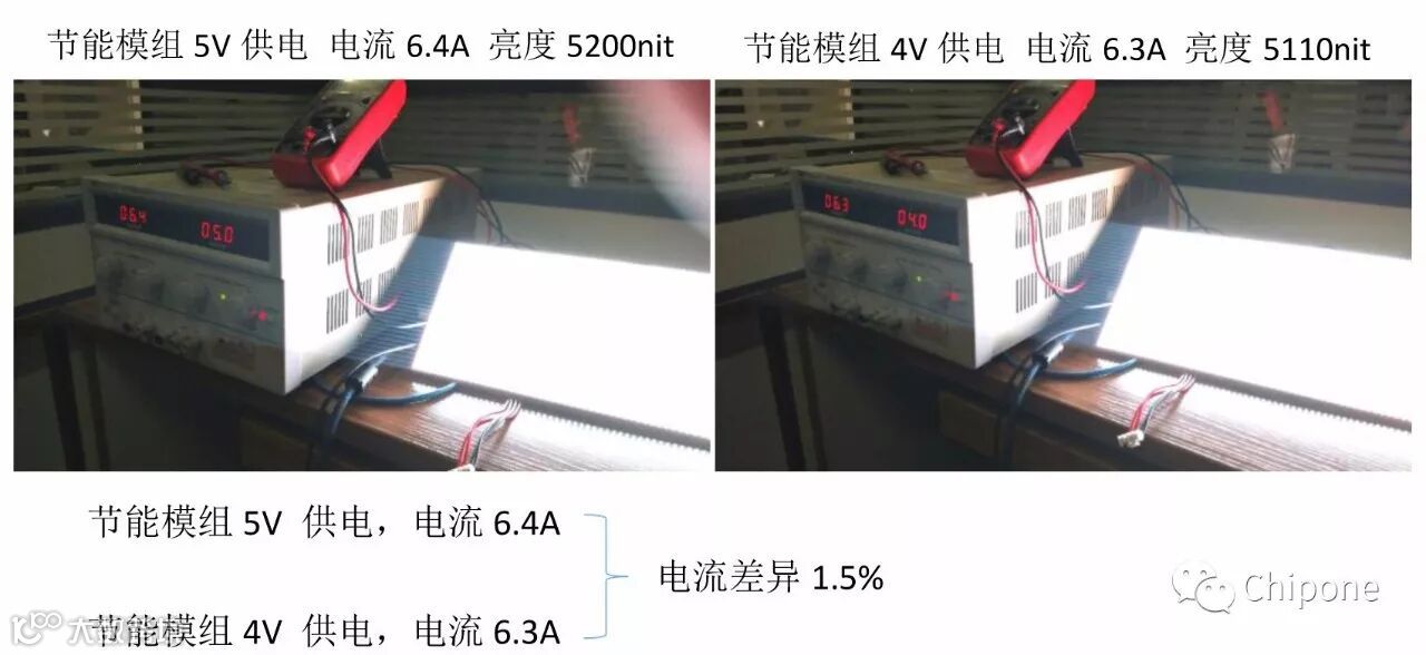 经测试P5和P8的模组均可使用4V电压供电保证模组电流、亮度、颜色无变化,实测节能比例可达21%。
