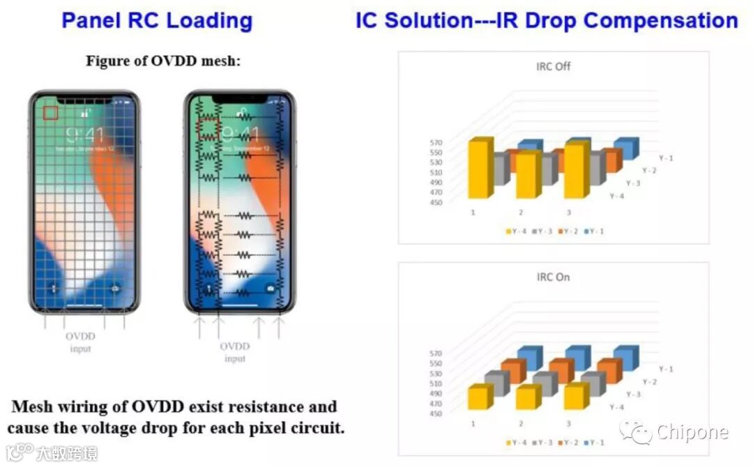 针对TFT背板技术,IC可以提供IR Drop Compensation的补偿算法技术,用于补偿面板内部由于金属走线过长而造成的面板走线的电阻过大,从而引起电流衰减的问题。