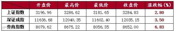 A股市场:本周A股市场持续反弹,三大股指悉数收涨,沪指涨2.80%,深成指涨3.5%,创业板指涨4.00%。本周成交持续放量,4个交易日成交突破万亿元,日均成交额10562亿元。