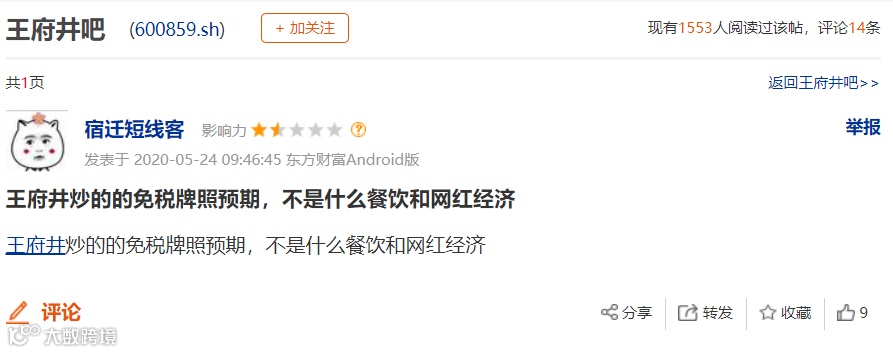 5月24日又有股吧网友在“王府井吧”留言称,“王府井炒的是免税牌照预期。”
