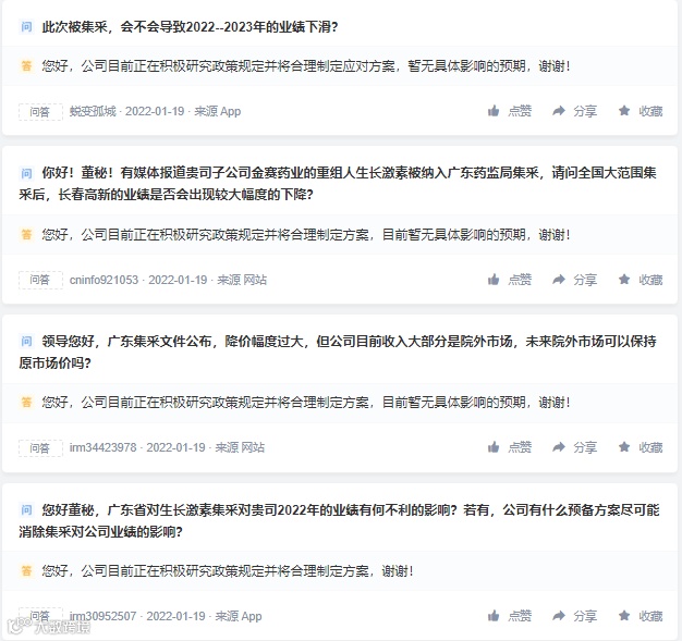 1月19日,广东省药品交易中心发布《广东联盟双氯芬酸等药品集中带量采购文件》,长春高新子公司金赛药业的重组人生长激素被纳入药品采购清单。《界面新闻》指出,金赛药业规格为30IU/10mg/3ml的生长激素注射液,在2020年2月至2021年3月期间的中标价格从未低于1031元,而本次集采价格为295.08元,降价幅度超70%。随后,长春高新在互动平台表示,“公司目前正在积极研究政策规定并将合理制定方案,目前暂无具体影响的预期。”