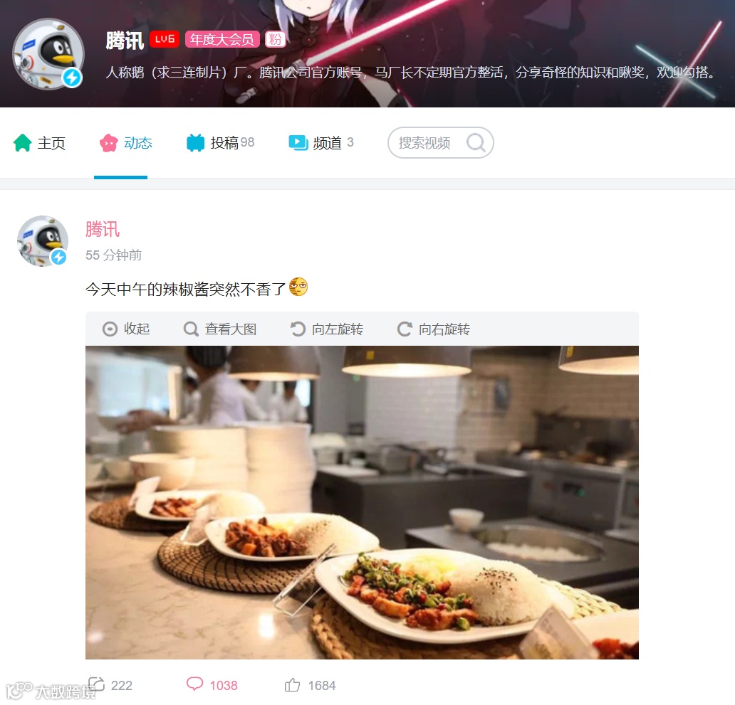 警方声明出来之后,腾讯在B站发了一条动态:今天中午的辣椒酱突然不香了