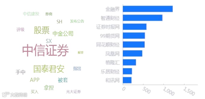 监测周期内,上市券商相关报道共24943篇,单家券商周平均报道数约为608篇,因本周仅4个工作日,声量总体相对较小。监测周期内,除微博外每日声量整体分布于3500-4000区间,周末声量较小。券商热度方面,中信证券、国泰君安、中金公司热度排名前三。媒体方面,金融界发布文章数据量最多,共1262条;智通财经次之,共987条;证券时报网位居第三,共566条。